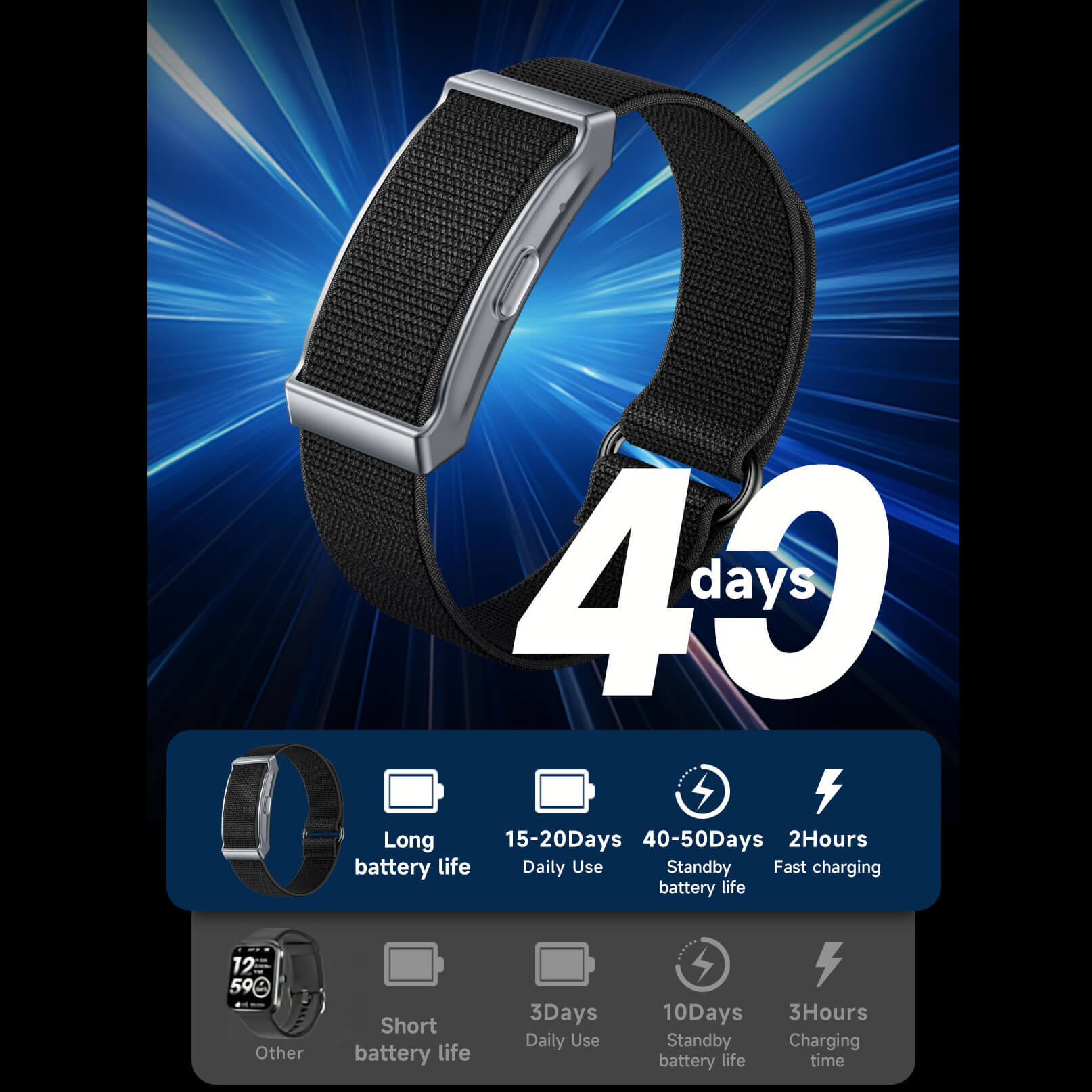 (2) Normally, it takes about 2 hours to fully charge. The standby time is around 21 days, and about 7 days with normal use. Note: enabling automatic heart rate detection and vibration alerts consumes more power and reduces battery life.