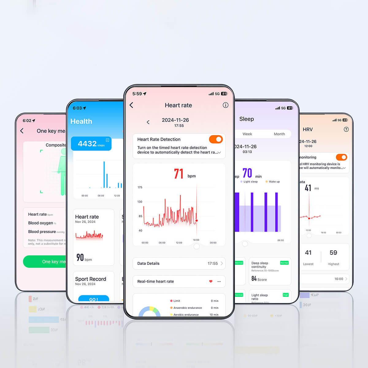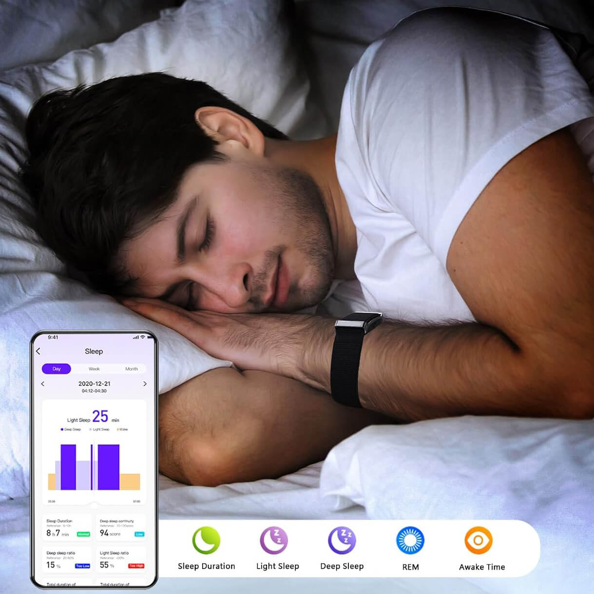 (2) The wristband records nighttime sleep data, starting within 30 minutes after lying down. Sleep is divided into three stages: deep, light, and awake. Getting up or lying down again may affect recorded sleep data.